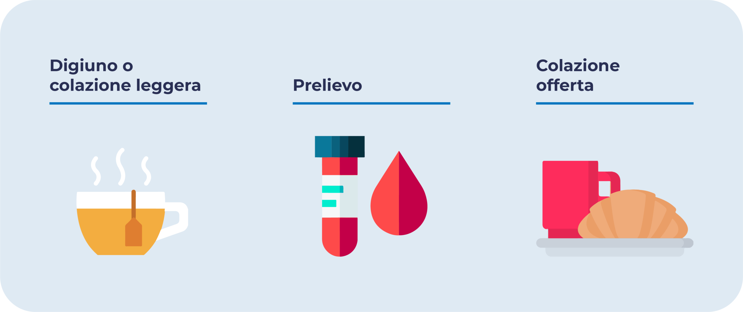 La mattina del prelievo è preferibile aver fatto una colazione leggera a base di frutta fresca o spremute, tè o caffè poco zuccherati, pane non condito o altri carboidrati semplici.